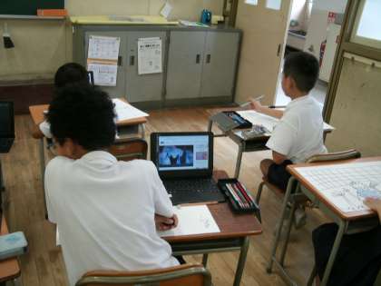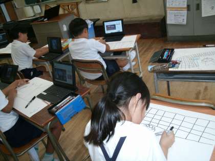 九条東納涼盆踊り大会に登場した「ミャクミャク」の写真を参考にしている児童もいました。