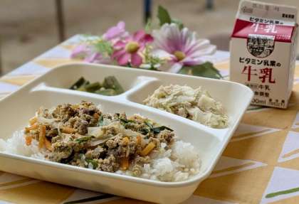 きょうの献立は、他人丼、ささみとキャベツのいためもの、オクラの甘酢あえ、牛乳でした。