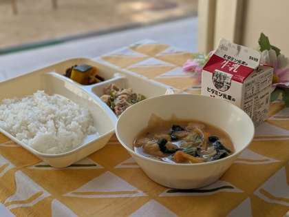 今日の給食は、ごはん、豚肉の甘辛焼き、みそ汁、かぼちゃの