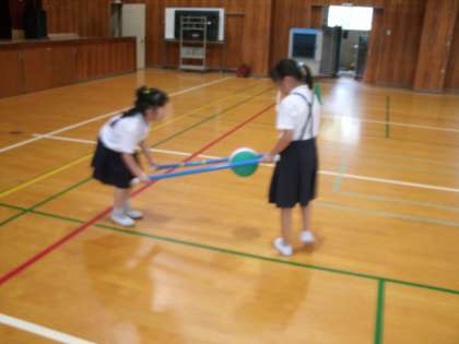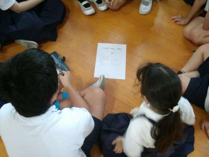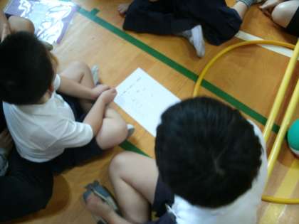 今日の集会は、スポーツフェスタのたてわり競技「ボール運びリレー」の練習でした。まず最初に班で、ペアと順番を決めました。