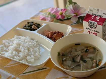 きょうの献立は、ごはん、鶏肉のチリソース焼き、焼き豚のスープ、ツナとさんどまめのいためもの、牛乳でした。