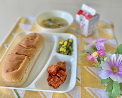 きょうの献立は、黒糖パン、まぐろのオーロラ煮、スープ、さんどまめとコーンのサラダ、牛乳でした。