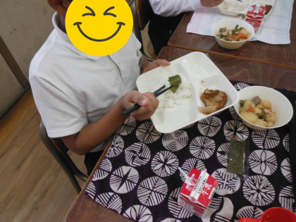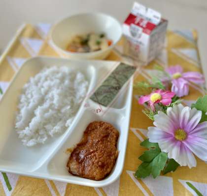 きょうの献立は、ごはん、みそカツ、じゃがいもと野菜の煮もの、焼きのり、牛乳でした。