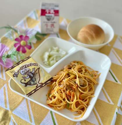 きょうの献立は、ミニコッペパン、イタリアンスパゲッティ、サワーキャベツ、カレーフィッシュ、牛乳でした。