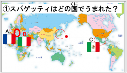 給食時間は、イタリア料理クイズで盛り上がりました。イタリア料理といえば、スパゲッティのほかに、ピザやミネストローネなどが有名です。