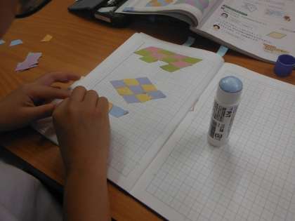 今日は同じ四角形を敷き詰めて、四角形をつくる活動を