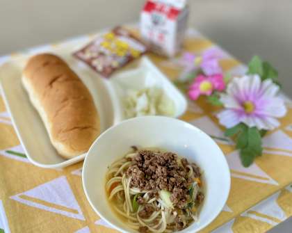 きょうの献立は、おさつパン、タンタンめん、キャベツの甘酢づけ、おさつチップス、牛乳でした。