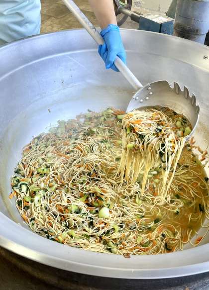 タンタンめんは、チンゲンサイなどの野菜やすりごま、ラー油を使った「汁めん」に、テンメンジャンや赤みそなどで味つけした「肉みそ」をのせていただきます。「めっちゃおいしい!」と大好評でした。