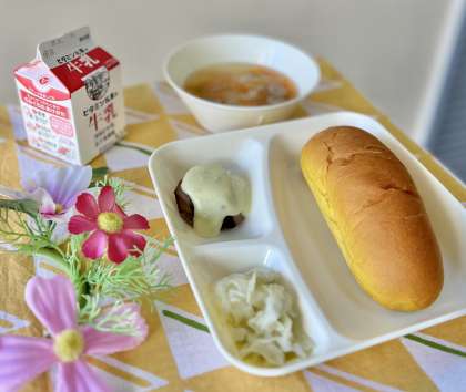 きょうの献立は、パンプキンパン、かつおのガーリックソースかけ、ウインナーとじゃがいものスープ、キャベツのサラダ、牛乳でした。