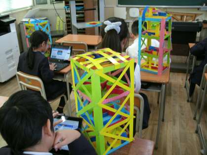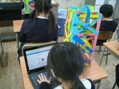 完成した「コロコロガーレ」の作品を机に置き、頑張ったことや作品の写真をタブレットで記録していました。