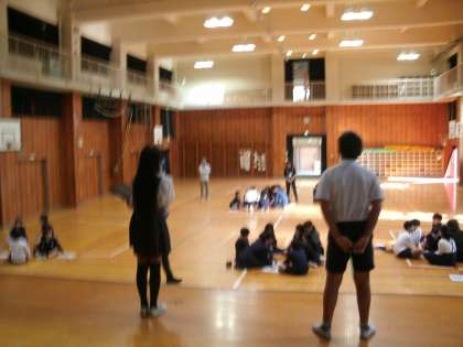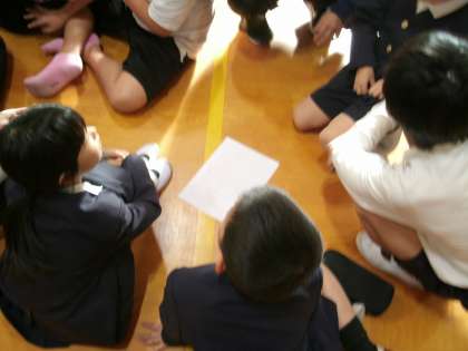 今日の集会は「回答いっちゲーム」でした。マリオのゲームと言えば○○、万博と言えば○○という質問が出ます。他の班と答えが一致するように回答します。