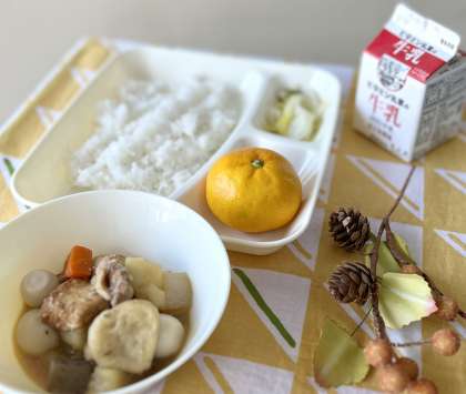 きょうの献立は、ごはん、関東煮、はくさいの甘酢あえ、みかん、牛乳でした。