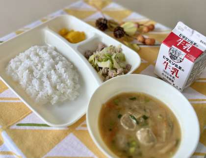 きょうの献立は、ごはん、豚肉と野菜のいためもの、いわしのつみれ汁、かぼちゃういろう、牛乳でした。