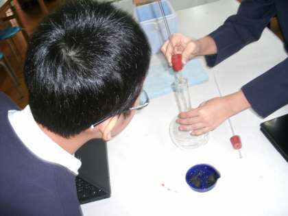 実験の方法をしっかり聞き、その後、班で協力して実験を行っていました。