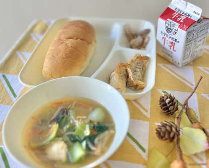 きょうの献立は、おさつパン、あげギョーザ、中華みそスープ、れんこんの中華だれかけ、牛乳でした。