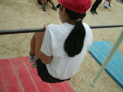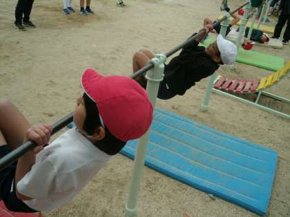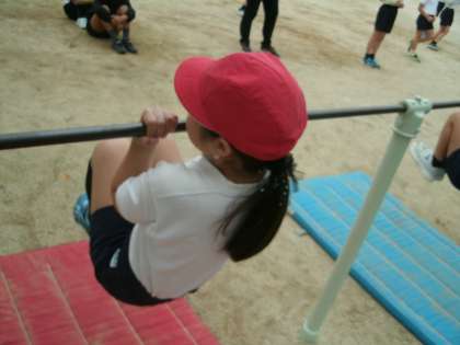 鉄棒の練習です。逆上がりができるように、まず、腕を曲げ、体を引き付ける練習をしていました。