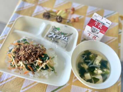 きょうの献立は、ビビンバ、わかめのスープ、ミニフィッシュ、牛乳でした。