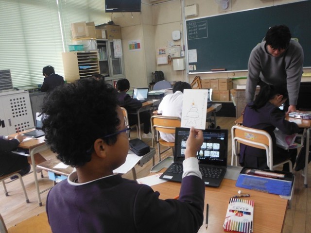 年賀状の書き方について学びました。パソコンで絵を調べて描いたりしながら