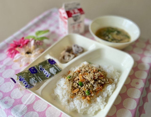 きょうの献立は、鶏ごぼうご飯、みそ汁、焼きれんこん、牛乳でした。