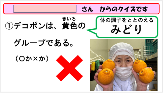 デコポンは果物なので、3色栄養で分けると緑グループです。給食クイズで、見た目にだまされないで正解していた子どもたち、さすがでした☆