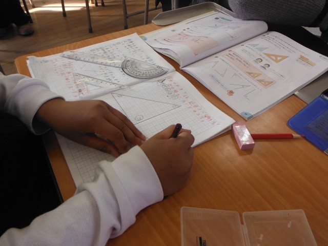 先生の持っている大きな三角定規と、自分たちが持っている小さな三角定規の、