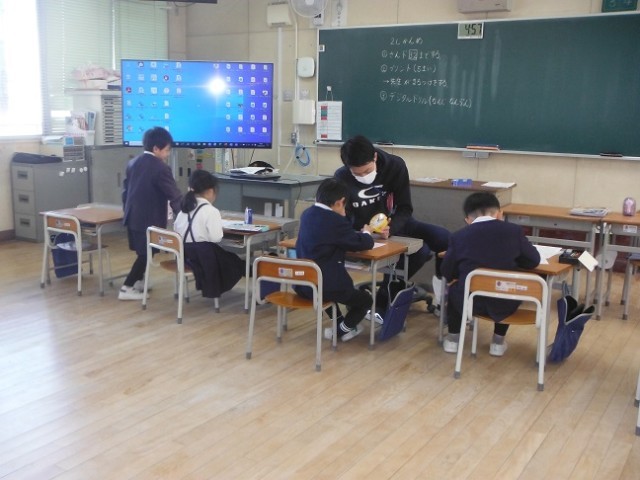 1年生は算数の時間、プリント学習に取り組んでいました。
