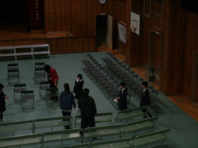 シート敷きの後、4・5年生の児童が、椅子並べや