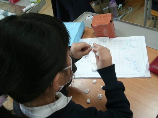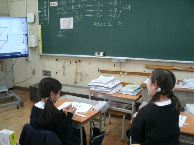 算数「はこの形」の学習です。今日は、粘土玉(8個)とストロー