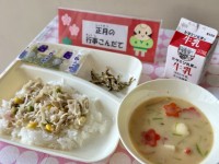 きょうの献立は、れんこんのちらしずし、ぞう煮、ごまめ、牛乳でした。「正月の行事献...