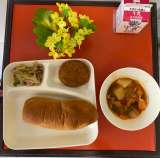 今日の給食は、チキンレバーカツ・ケチャップ煮・たことキャベツのバジルソテー・黒糖...
