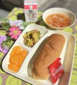 きょうの献立は、コッペパン、カレーマカロニグラタン、トマトスープ、みかん(缶)、...