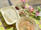 きょうの献立は、ごはん、鶏肉のてり焼き、かぼちゃのみそ汁、なすのそぼろいため、牛...