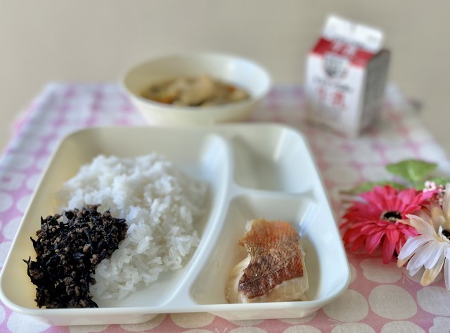 きょうの献立は、ごはん、あかうおのレモンじょうゆかけ、みそ汁、牛ひじきそぼろ、牛...