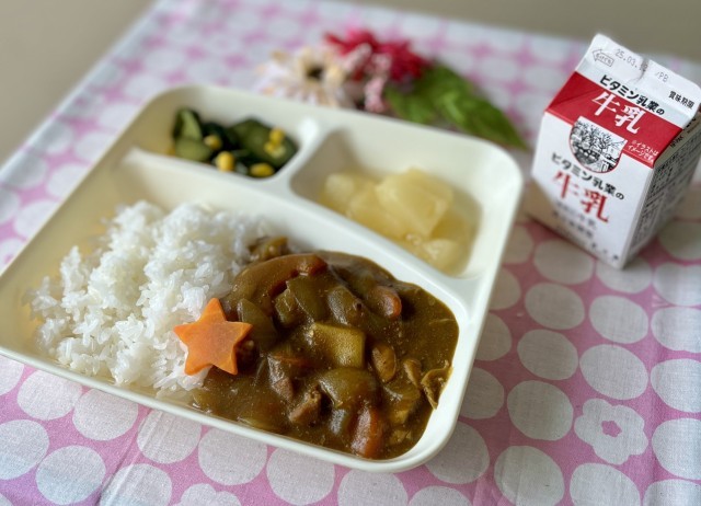 きょうの献立は、チキンレバーカレーライス、きゅうりとコーンのサラダ、洋なし(カッ...