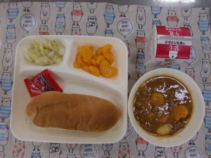 今日の給食は、「コッペパン、ビーフシチュー、キャベツのピクルス、みかん(缶)、いちごジャム、牛乳」でした。給食のビーフシチューは、時間をかけて手作りしたブラウンルウでとろみをつけています。そして、星やハート、花、魚などのいろいろな形をしたにんじんが入っていました。九条北小では、こうしたかわいい形のにんじんを「ラッキーにんじん」と呼んでいます。このにんじんが入っていたら今日はラッキー!入っていなかったら次をお楽しみに!今日は調理員さんがたくさんのラッキーをみんなにプレゼントしてくれました。