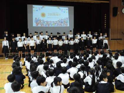 4月25日(木)の臨時児童集会で、6年生が全校児童に向けて100周年のプレゼンをしました。