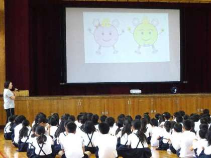 そのあと、児童会担当の先生から、キャラクターの発表がありました。子どもたちから募集して寄せられたキャラクターをもとにしています。次は名前の募集。どのように命名されるでしょうか。