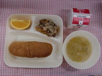 今日の給食は「おさつパン、かぼちゃのミートグラタン、スープ、オレンジ、牛乳」でした。緑黄色野菜のかぼちゃは、抗酸化作用や免疫機能を高めるβ(ベータ)-カロテンを豊富に含んでいます。ひき肉を加え、ケチャップで味つけした食べやすいミートグラタンにして、たっぷりかぼちゃを食べることができました。