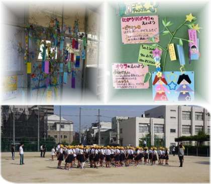 7月8日(月) 昨日は七夕。校内にもいくつか笹が飾られています。さて、今日の児童朝会のようすです。
