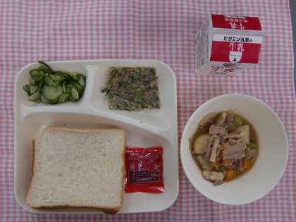 今日の給食は、「食パン、もずく入りヒラヤーチー、豚肉といかの煮もの、あっさりきゅうり、いちごジャム、牛乳」でした。今日は、給食前から「ヒラヤーチーってなに?」と何度も聞かれました。ヒラヤーチーは、小麦粉、卵、水などを混ぜ合わせて、いろいろな具材を加えた生地を平たくのばして焼いた料理です。