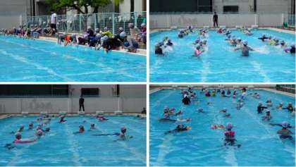 2学年ずつプール水泳の時間に着衣水泳を行います。水難事故に遭遇したときに自分を守る学習です。