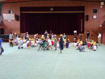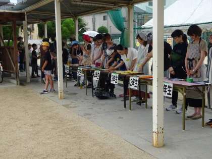 午前9時、運動場に集まったお父さん方が、準備を始めました。