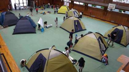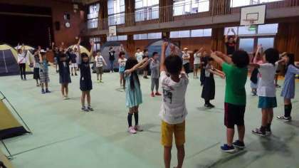 ラジオ体操の後、朝食のおにぎりを食べました。テントの片づけは、みんな協力して、本当に素早く終えることができました。解散まで少し時間ができたので、雨の止んだ運動場で楽しく遊ぶ時間となりました。