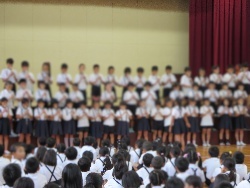 10月3日金曜日、3年生による音楽朝会がありました。3年生は、まず、リコーダーで「よろこびの歌」を演奏しました。次に、「ふるさと」を合唱しました。5日の日曜日に本校講堂で敬老会が開催されます。今年も3年生が参加し、今日と同じ内容で、音楽発表をおこないます。参加者の方々に子どもたちの気持ちが伝わればいいなと思います。