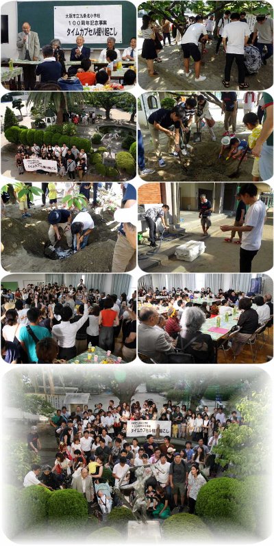 20年前、創立80周年記念事業での約束にあった、創立100周年への未来の子どもたちへのプレゼントです。120名を超える卒業生も集まってくれました。当時の校長先生・教頭先生をはじめ、何人かの教職員のみなさんにも来ていただき、タイムカプセルを掘り起こしました。