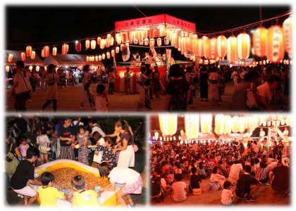日が暮れて、盆踊りも最高潮。櫓の上にのって、元気に踊る子どもたちもいました。でも、子どもたちの多くは、ゲームコーナーに集まっていたようです。8時20分のお菓子配りの時間になると、どんどん集まってきて、櫓前の半分を埋め尽くしました。子どもたちは、お菓子をもらって帰り、これからは大人の時間です。
