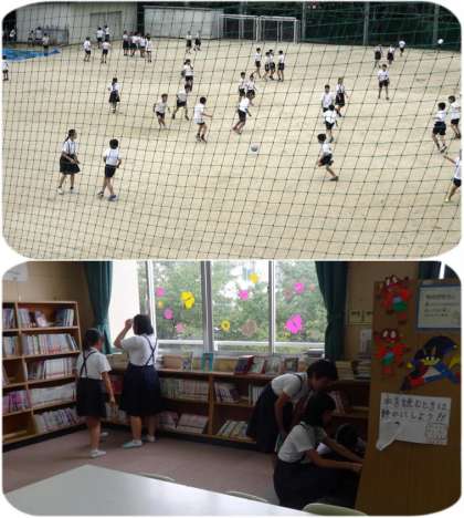 今日は朝から雨が降っていたため、6年生の水泳交流会は中止となりました。でも、雨が小休止した昼休みには、たくさんの子どもたちが運動場に出て、元気よく遊んでいました。