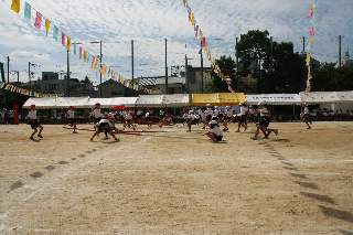 団体競技が3つ続きました。2年生の「大玉ころがし」。4年生の棒引き「力を合わせて引っぱれ!」。6年生の「騎馬戦」です。
