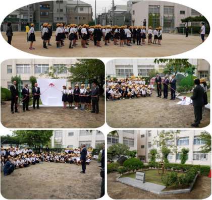 夏休みに創立百周年記念に植樹していただいたイペーの木の周囲の整備が先週終わりました。御影石づくりの記念碑も立てられましたので、本日の児童朝会の後、除幕式が行われ、子どもたちへ披露されました。