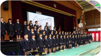 100年という大きな節目を迎え、厳粛な雰囲気の中、123名のご来賓の皆様も迎え、式典を行いました。式典には、在校生の代表として5・6年生が参列し、喜びのことばを発表し、立派に努めることができました。九条北の歴史をスライドで映しながら、元気な呼びかけ、歌声が式場に響いていました。